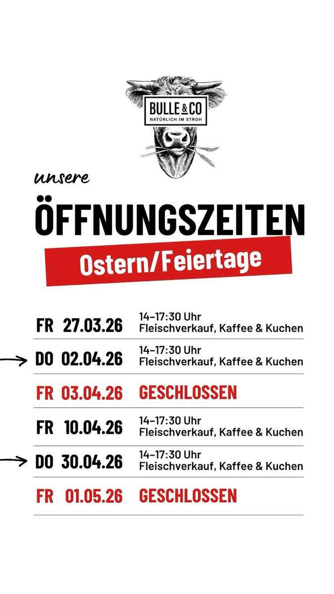 Du kannst ohne Vorbestellung jeden von Freitag 14:00–17:30 Uhr bei uns vorbeikommen und leckerstes Bullenfleisch aussuchen. Es ist immer (fast) alles da – auch ohne Vorbestellung!