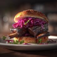 2. Beef Ribs im Burger Zarte Rinderrippen im Bun, kombiniert mit hausgemachtem Rotkraut und Crunch. Rustikal. Knusprig. Unvergesslich.