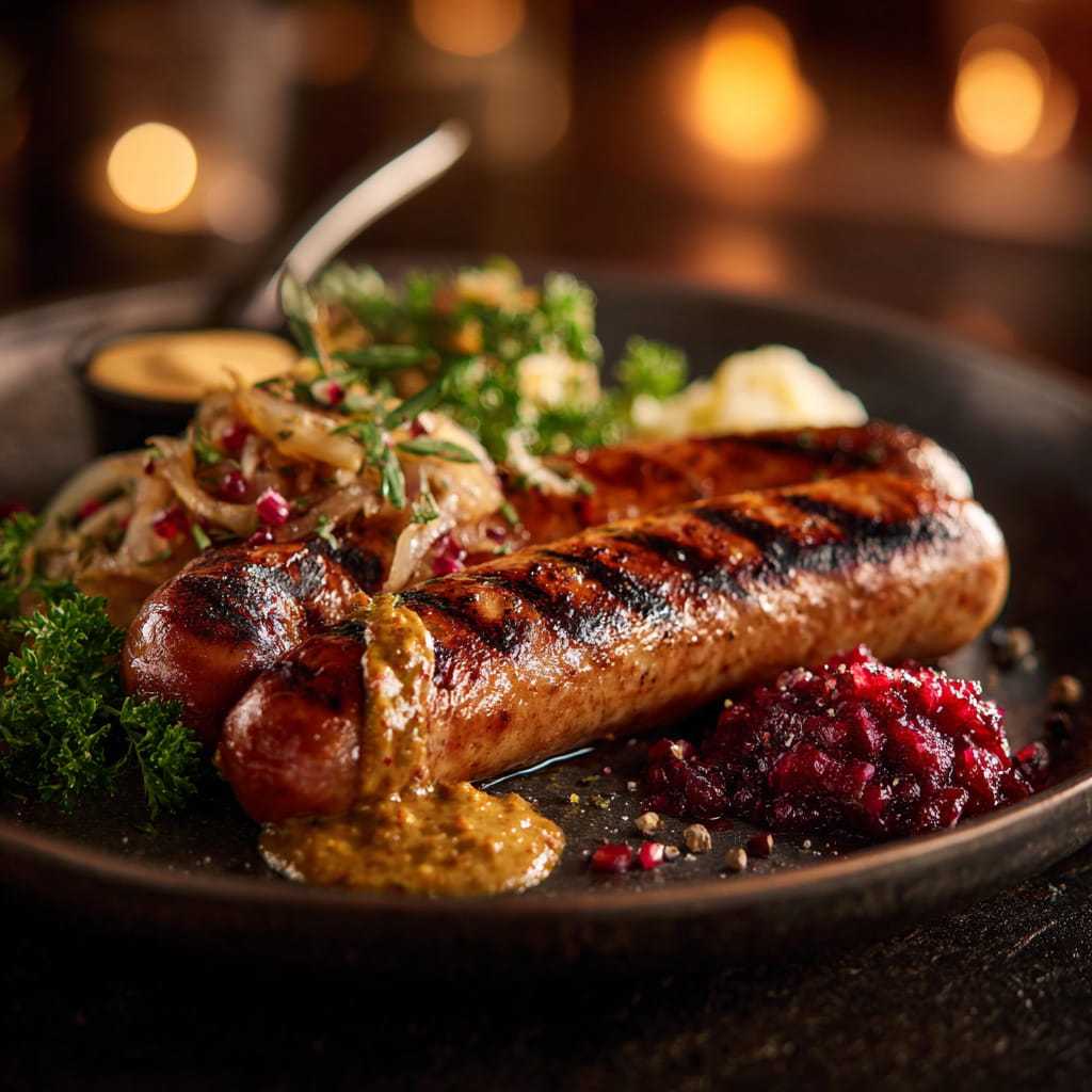 Bratwurst vom Schwarzwild mit Apfel-Wacholder-Kraut, geschmorten Zwiebeln und Preiselbeer-Senf